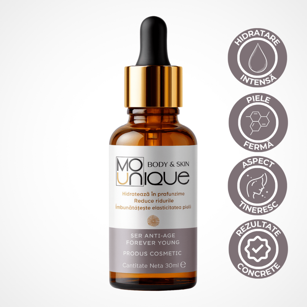 Timpul nu trebuie să definească pielea ta. Am creat serul "Forever Young" ca o soluție anti-age completă, ce acționează pe toate fronturile: reface structura de colagen, fortifică bariera pielii și oferă o hidratare excepțională. Descoperă o formulă inteligentă care luptă vizibil împotriva ridurilor, pierderii fermității și nuanței neuniforme.
