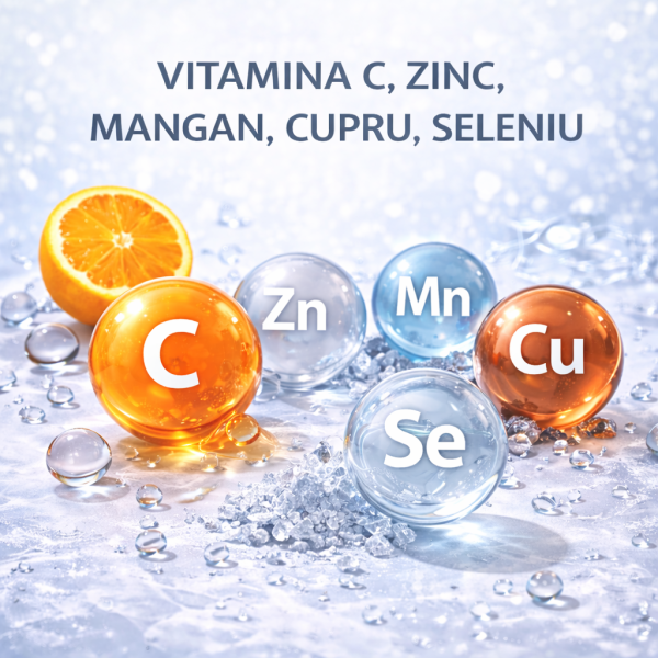 Supliment alimentar premium în capsule vegetale cu Vitamina C, Zinc, Mangan, Cupru și Seleniu pentru imunitate și vitalitatea pielii.